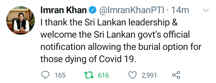 මෙරට කොවිඩ් මරණ භුමදානයට අවසර ලැබෙන පරිදි රජය ගත් තීරණයට පකිස්ථාන අගමැති ඉම් රාන් ඛාන් සිය ප්රසාදය පළකර ඇත.