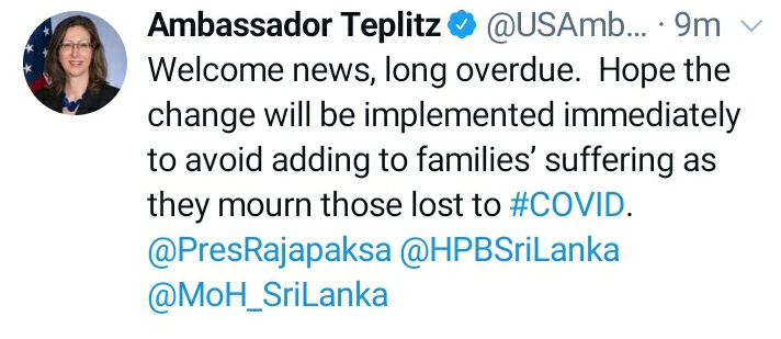 මේ අතර ශ්රීලංකාවේ ඇමෙරිකානු තානාපතිනිය ට්විටර් පණිවුඩයක් මගින් ප්රකාශයට පත්කලේ මෙම තීන්දුව පමාවී හෝ ගනු ලැබූ යහපත් එකක් බවයි.