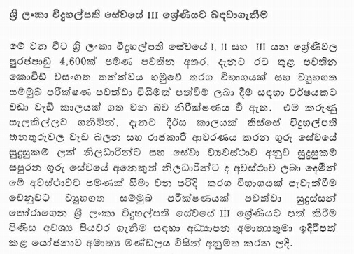 ශ්‍රීලංකා විදුහල්පති සේවයේ තුන්වන ශ්‍රේණියට බඳවාගැනීම මෙවරට පමණක් අදාල වන පරිදි සම්මුඛ පරීක්ෂණයක් මගින් සිදුකිරීමට  අදාළ කැබිනට් තීරණය පහත දැක්වේ.