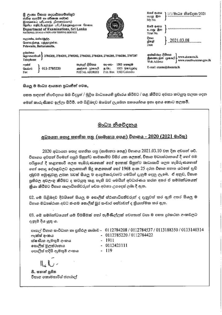 මේ අදාළ කරුණ සම්බන්ධයෙන් විභාග දෙපාර්තමේන්තුව නිකුත් කළ නිවේදනයයි
