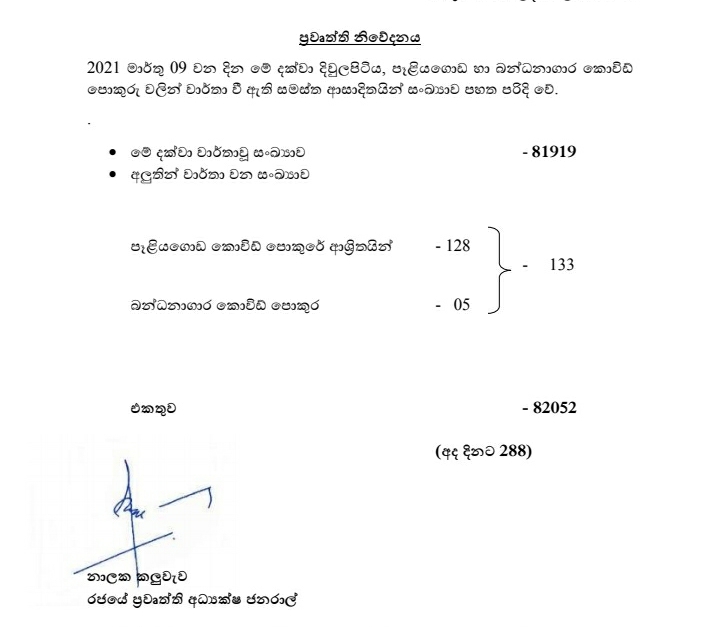 පසුගිය නොවැම්බර් මාසයට පසු මෙරට අඩුම දෛනික කොවිඩ් ආසාදිතයින් ගණන වාර්තා වූයේ අදයි . ඒ 288ක් ලෙසිනි. 2021-03-09