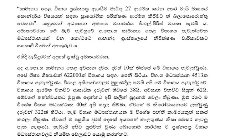 අධ්‍යයන පොදු සහතික පත්‍ර සාමාන්‍ය පෙළ විභාගය අද අවසන් වූ අතර කොවිඩ් අභියෝගය මධ්‍යයේ පැවැති විභාගයේ කටයුතු අවසන් වූ ආකාරය සොයා බැලීමට අධ්‍යාපන අමාත්‍යවරයාද කෝට්ටේ පාසලකට අද පැමිණියා.