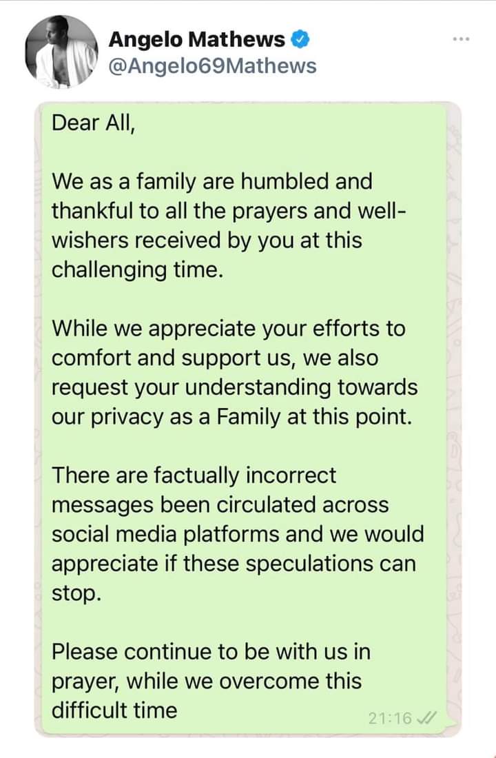 තම පවුලේ පෞද්ගලිකත්වය ආරක්ෂා කිරීමේ වැදගත් කම පෙන්වාදෙන ඔහු මෙම අවස්ථාවේ තමා සමග සිටින හිතෛෂීවන්ත ජනතාවට ස්තුතිය පළකරන අතර තම පවුල සම්බන්ධයෙන් පදනම් විරහිත කටකතා පැතිරවීමෙන් වළකින ලෙස ද ඉල්ලා සිටී.