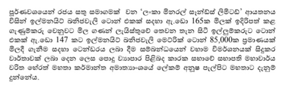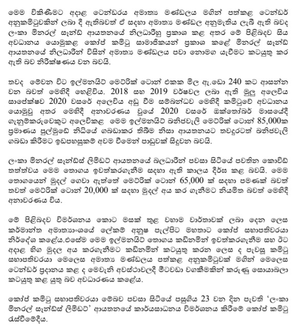 ටොන් එකක් සඳහා ඇමෙරිකානු ඩොලර් 18 ක පාඩු පිට ඉල්මනයිට් ඛනිජ වැලි ටොන් 85000ක් අලෙවි කිරීමක් පිලිබඳව කෝප් කමිටුවේදී හෙලිවී ඇත. මෙම වංචාව සිදුව ඇත්තේ 2020වසරේදීය. එම ගනුදෙනුවට අදාලව ටොන් 20000ක මුදල් ද තවමත් ගෙවා නැතැයි හෙළිවී තිබේ. 2021-03-26