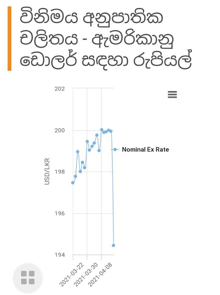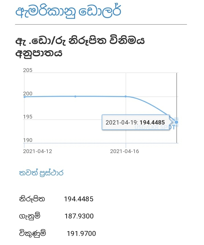 ඇමෙරිකානු ඩොලරය ට සාපේක්ෂව රුපියල අද තවදුරටත් ශක්තිමත් විය. මෙය ගතවූ මාස කිහිපයක් තුළ රුපියල ශක්තිමත් වූ ප්රබලම අගය බව ශ්රීලංකා මහබැංකුව කියයි. අද එම විනිමය අනුපාතය දැක්වුණේ මෙලෙසිනි. මීට පෙර දින ගණනාවක් රුපියල ඩොලරය ට සාපේක්ෂව පැවතියේ 200ට ඉහළ අගයකිනි. 2021-04-19